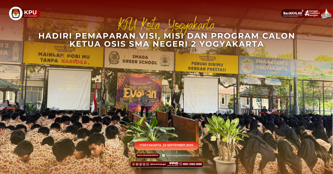Komisi Pemilihan Umum (KPU) Kota Yogyakarta terus mendorong pendidikan demokrasi sejak dini, salah satunya melalui berbagai kegiatan pendidikan politik di sekolah. Setelah sebelumnya mengisi materi dalam kegiatan Masa Pengenalan Lingkungan Sekolah (MPLS) kali ini kembali hadir secara langsung dalam pelaksanaan Debat Calon Ketua OSIS (Caketos) di SMA Negeri 2 Yogyakarta, Selasa (23/9).