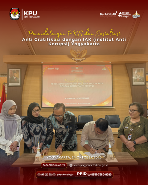 Yogyakarta - Bertempat di Pendopo KPU Kota Yogyakarta, Jumat (24/10) KPU Kota Yogyakarta menggelar kegiatan penandatangan Perjanjian Kerja Sama (PKS) dengan Institut Anti Korupsi Yogyakarta berkaitan dengan upaya sosialisasi dan pendidikan anti korupsi dan anti gratifikasi. Tindak lanjut dari perjanjian kerjasana yang telah dilakukan, setelah penandatanganan PKS dilaksanakan Sosialisasi dan Peningkatan Pemahaman Anti Gratifikasi dalam Rangka Mendukung Pembangunan Zona Integritas Menuju WBK dan WBBM di KPU Kota Yogyakarta. Acara di ikuti oleh Ketua dan Anggota KPU Kota Yogyakarta, Sekretaris dan seluruh jajaran di Sekretariat KPU Kota Yogyakarta. Sebagai pemateri adalah Ahmad Farisi, Direktur Institute Anti Korupsi Yogyakarta.
