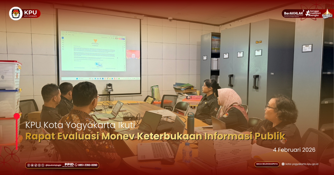 Yogyakarta — Komisi Pemilihan Umum (KPU) Daerah Istimewa Yogyakarta (DIY) menyelenggarakan Rapat Evaluasi Monitoring dan Evaluasi (Monev) Keterbukaan Informasi Publik yang diikuti oleh KPU kabupaten/Kota se DIY melalui zoom meeting. KPU Kota Yogyakarta hadir diwakili oleh Ketua KPU Kota Yogyakarta, Ketua Divisi Sosialisasi, pendidikan Pemilih, Partisipasi Masyarakat dan SDM, Sekretaris, Kasubbag Pengampu Parmas dan Staf. Kegiatan ini dilaksanakan sebagai upaya penguatan tata kelola layanan informasi publik yang transparan, akuntabel, dan sesuai dengan ketentuan peraturan perundang-undangan.