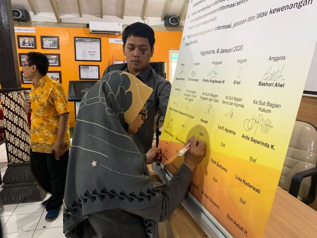 Setelah sharing knowledge berakhir, dilanjutkan dengan Penandatanganan komitmen dan kinerja seluruh staff sekretariat di KPU Kota Yogyakarta setelah di hari sebelumnya jajaran komisioner dan struktural sekretariat telah melaksanakan kegiatan yang sama, tujuannya untuk menyepakati hal-hal yang berhubungan dengan target kinerja dan target capaian realisasi, sehingga masing-masing penanggungjawab program dapat melaksanakan kegiatan sesuai dengan jadwal yang ada.