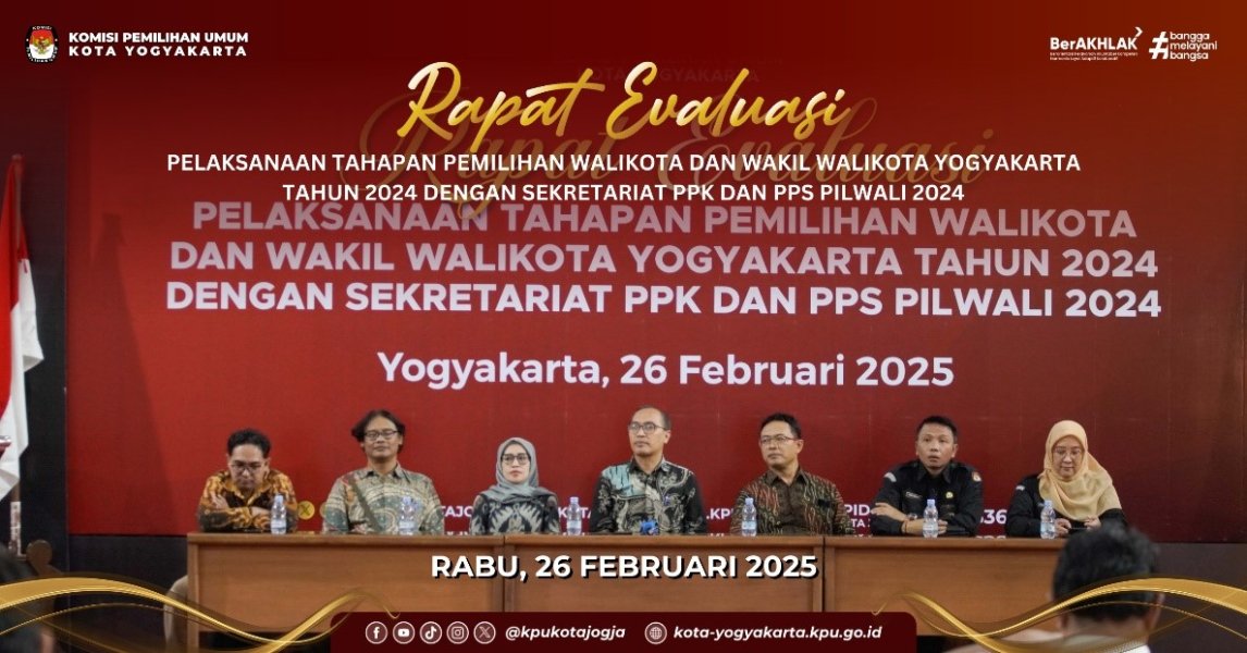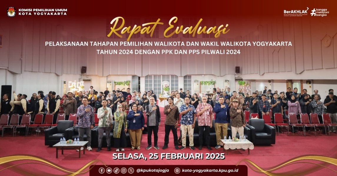 Yogyakarta – Sebagai bagian dari upaya peningkatan kualitas penyelenggaraan pemilu, Komisi Pemilihan Umum (KPU) Kota Yogyakarta menggelar Rapat Evaluasi Tahapan Pemilihan Walikota dan Wakil Walikota Yogyakarta Tahun 2024 bersama Sekretariat Panitia Pemilihan Kecamatan (PPK) dan Sekretariat Panitia Pemungutan Suara (PPS) se-Kota Yogyakarta. Kegiatan ini berlangsung pada Rabu, 26 Februari 2025, di Gedung Auditorium LPP Yogyakarta, dihadiri oleh Ketua KPU Kota Yogyakarta, Noor Harsya Aryosamodro, beserta jajaran Anggota KPU Kota Yogyakarta, Plh. Sekretaris KPU Kota Yogyakarta, perwakilan KPU DIY, Kepala Badan Kesatuan Bangsa dan Politik (Bakesbangpol) Kota Yogyakarta, serta perwakilan Tata Pemerintahan Kota Yogyakarta dan Polresta Kota Yogyakarta.