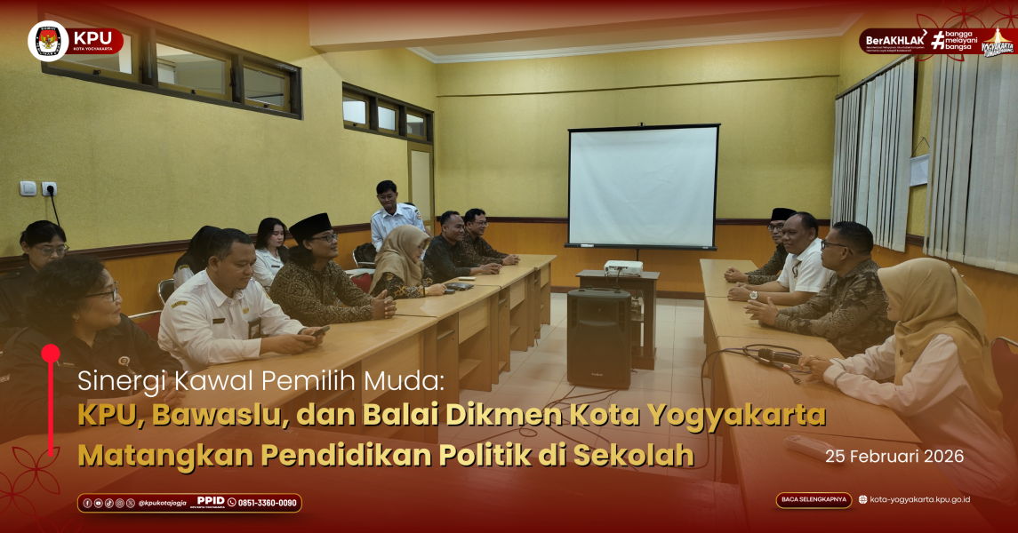 YOGYAKARTA – Langkah kolaboratif untuk perkuat kualitas demokrasi di kalangan generasi muda terus diperkuat. Komisi Pemilihan Umum (KPU) Kota Yogyakarta bersama Badan Pengawas Pemilu (Bawaslu) Kota Yogyakarta lakukan audiensi strategis ke Balai Pendidikan Menengah (Dikmen) Kota Yogyakarta pada Rabu (25/2/2026). Pertemuan yang berlangsung di Ruang Rapat Balai Dikmen ini dihadiri oleh formasi lengkap pimpinan kedua lembaga, yakni Ketua, Anggota, dan Sekretaris KPU serta Bawaslu Kota Yogyakarta. Kehadiran rombongan penyelenggara pemilu ini diterima langsung dengan hangat oleh Kepala Balai Pendidikan Menengah Yogyakarta beserta jajarannya. Acara dibuka oleh Ketua KPU Kota Yogyakarta, Noor Harsya Aryosamodro, yang tekankan pentingnya kerja sama lintas institusi untuk menjangkau pemilih di tingkat sekolah menengah atas. Senada dengan hal tersebut, Ketua Bawaslu Kota Yogyakarta berikan pengantar mengenai urgensi pengawasan sejak dini di lingkungan pendidikan. Kepala Balai Dikmen Yogyakarta sambut baik inisiatif ini dan menyatakan kesiapannya untuk bantu jembatani program-program edukasi demokrasi bagi siswa di wilayah Kota Yogyakarta. Dalam sesi pembahasan gagasan, Anggota KPU Kota Yogyakarta, Agus Muhamad Yasin, memaparkan rencana strategis mengenai Pendidikan Pemilih Pemula. Beliau menekankan bahwa siswa SMA/SMK sederajat harus memiliki literasi politik yang kuat agar menjadi pemilih yang cerdas dan mandiri. Sementara itu, Siti Nurhayati dari Bawaslu Kota Yogyakarta memaparkan urgensi Pendidikan Pengawas Partisipatif agar para pelajar berani ikut serta mengawasi jalannya proses demokrasi. Satu poin krusial yang menjadi sorotan dalam audiensi ini adalah saran inovatif dari pihak Bawaslu yang telah dibicarakan bersama KPU, yakni gagasan Majelis Permusyawaratan Kelas (MPK) di tingkat Kota Yogyakarta. untuk membuka ruang diskusi yang lebih luas dan terstruktur bagi para siswa yang menjabat sebagai pengurus MPK di sekolah masing-masing. Di forum MPK tingkat kota, para siswa dapat saling bertukar pikiran dan mendalami tata kelola organisasi serta nilai-nilai demokrasi secara lebih mendalam dan aplikatif. Diskusi interaktif yang berlangsung hangat ini menghasilkan kesepahaman untuk menyatukan visi dalam mengedukasi generasi Z di Yogyakarta. Topik utama yang dibahas menjadi pondasi untuk menyusun jadwal sosialisasi yang terintegrasi di sekolah-sekolah di bawah naungan Balai Dikmen. Audiensi ditutup dengan kesepakatan untuk segera menindaklanjuti poin-poin kerja sama tersebut dalam bentuk aksi nyata di lapangan. Bagi masyarakat, khususnya para orang tua dan tenaga pendidik, langkah ini merupakan jaminan bahwa pendidikan demokrasi di Kota Yogyakarta dijalankan secara profesional, inklusif, dan berintegritas guna mencetak generasi penerus yang sadar akan hak dan kewajiban politiknya. (sals)