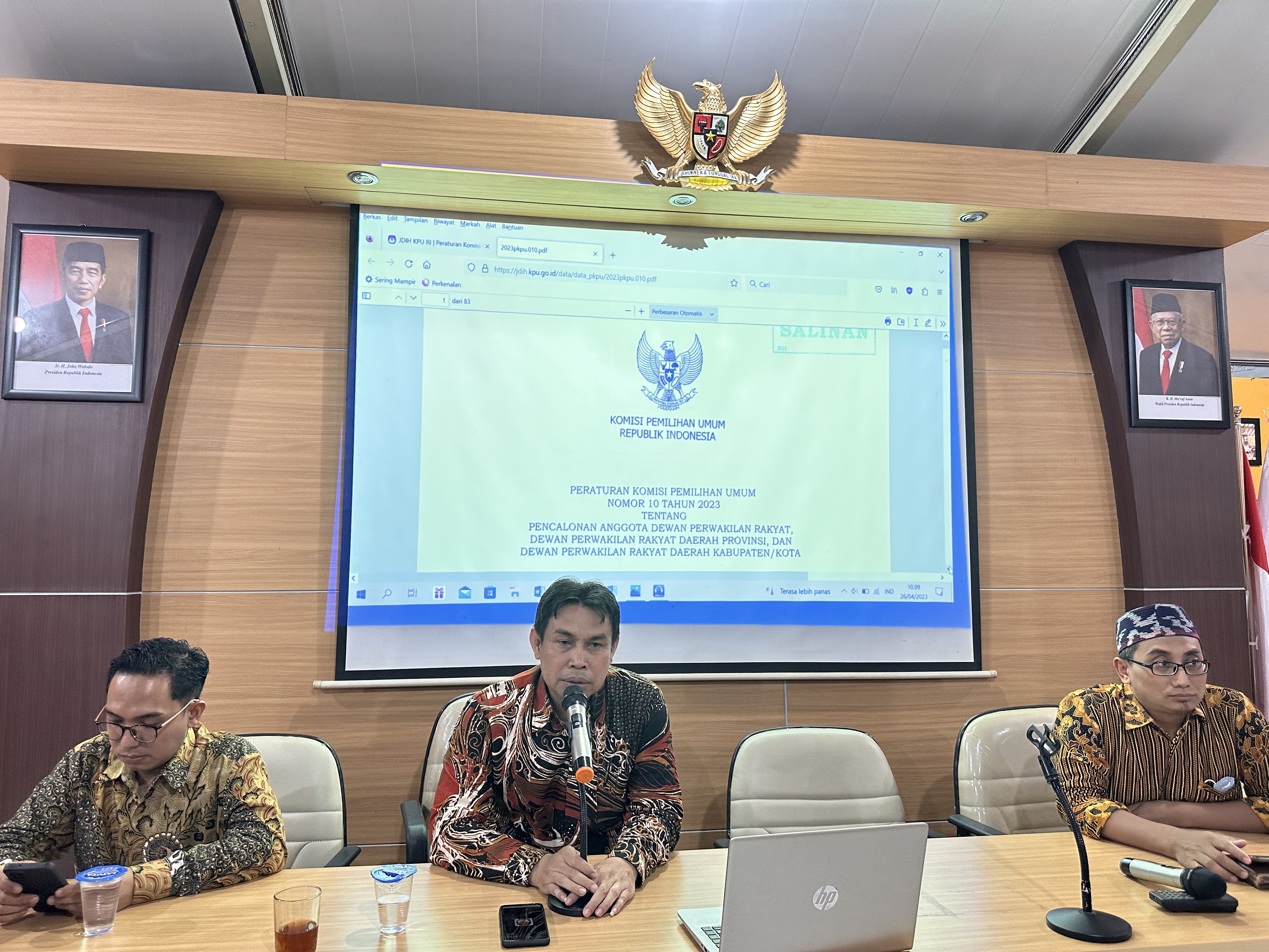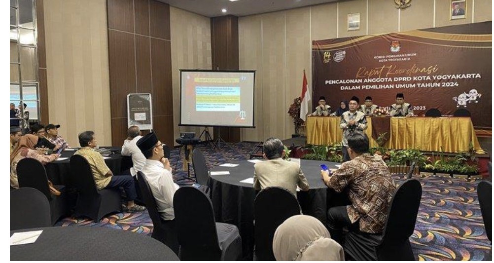Yogyakarta- Ketua Komisi Pemilihan Umum (KPU) Kota Yogyakarta Hidayat Widodo, Anggota KPU Erizal, Frengki Argitawan, Bashori Alwi dan Siti Nurhayati bersama Sekretaris KPU Analis Primadani hadir pada Rapat Koordinasi Pencalonan Anggota DPRD Kota Yogyakarta dalam Pemilihan Umum Tahun 2024 di Hotel Tara Yogyakarta, Selasa (18/4/2023). Hidayat memaparkan maksud dan tujuan pelaksanaan rapat koordinasi adalah untuk menyampaikan informasi terkait jadwal tahapan proses pemilihan calon Anggota DPRD sertakelengkapan persyaratan administrasi yang diperlukan kepada seluruh Partai Politik se-Kota Yogyakarta yang hadir. “Masalah administrasi ini sangat penting, sehingga kita harus mulai tancap gas dan menyiapkan apa yang perlu disiapkan,”ungkap Hidayat. “Bakal calon anggota DPRD Kota Yogyakarta akan memulai proses persyaratan administrasi. Sebanyak 412 Bacaleg untuk Pemilu tahun 2019, UntukPemilu Tahun 2024 belum ada kepastian, tergantung berapajumlah yang diajukan peserta pemilu dan memenuhi persyaratan,”jelasnya. Untuk peserta pemilu di Kota Yogyakarta berjumlah 18 partai politik. Satu partai maksimal bisa mencalonkan 40 caleg,Bila 18 partai, maka bisa berjumlah 720 bakal calon,” tambahnya. Sementara itu Erizal selaku Ketua Divisi Teknis Penyelenggaraan Komisi Pemilihan Umum Kota Yogyakarta dalam kesempatannya menyampaikan tentang Rancangan PKPU Pencalonan Pemilu Anggota DPRD Tahun 2024. “Dalam tahapan pencalonan ini khususnya ketugasan KPU Kota Yogyakarta adalah pencalonan DPRD Kota Yogyakarta, dan wilayah beban kerja kita adalah 40 kursi, untuk tahapanini rujukan kita adalah UU Nomor 7 Tahun 2017, Putusan Mahkamah Konstitusi Nomor 87/PUU-XX/2022 yang mengatur tentang Masa Jeda 5 Tahun untuk Mantan Terpidana, dan Peraturan KPU nomor 3 Tahun 2022 tentang Tahapan dan Jadwal Penyelenggaraan Pemilihan Umum,”ungkap Erizal. “Untuk menjalankan amanah Undang Undang Dasar, mewujudkan regenerasi kepemimpinan lima tahun sekali, kita bisa mengkoordinasikan persiapan pencalonan ini antar stakeholder terkait, sehingga ketika sudah tiba waktunya, kita bisa menyelesaikan masalah tanpa masalah,”jelasnya. Hadir mengikuti jalannya rapat koordinasi, Bawaslu, Pengadilan Negeri, Kejaksaan Negeri, Kantor Kementrian Agama Kota Yogyakarta, Polresta Yogyakarta, Kodim 0734, BIN Kota Yogyakarta, OPD Pemerintah Kota Yogyakarta, Intansi terkait, Partai Politik se-Kota Yogyakarta dan awak media. (RN)