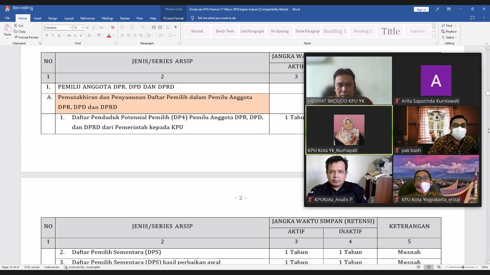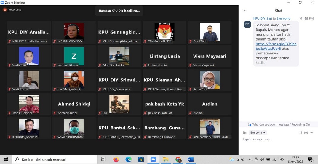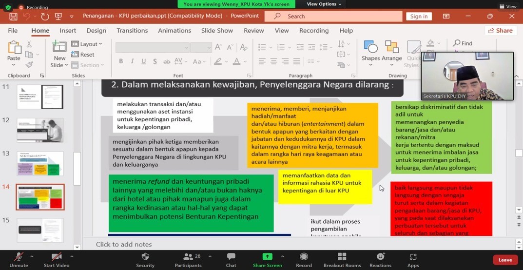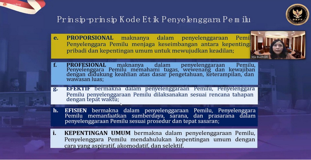 Yogyakarta, Kamis, 21 April 2022, dilaksanakan Sosialisasi Kode Etik dan Pedoman Penyelenggaraan Pemilu oleh Komisi Pemilihan Umum Daerah Istimewa Yogyakarta dengan narasumber Ida Budhiati, anggota Dewan Kehormatan Penyelenggaraan Pemilu (DKPP). Moderator acara sosialisasi adalah Siti Ghoniyatun, anggota Komisi Pemilihan Umum Daerah Istimewa Yogyakarta. Sosialisasi dihadiri seluruh komisioner, sekretaris, pejabat struktural, staf sekretariat , tenaga kontrak, tenaga pendukung KPU se-Daerah Istimewa Yogyakarta dan Bawaslu se-Daerah Istimewa Yogyakarta yang diselenggarakan secara online dengan aplikasi zoom meeting. “Kode perilaku penyelenggara pemilu harus didasari kemandirian dan integritas, harus bersifat jujur, akuntable. Pengawasan pengendalian internal tidak cukup hanya memenuhi rasa keadilan. Kode etik yang melekat di KPU dengan melindungi bawahannya. Setelah dilantik, KPU menjadi warganegara istimewa, ada rambu–rambu yaitu jujur, adil, transparan, efektif, efisien, akuntable, mandiri. Kedudukan KPU tidak sama dengan warga negara biasa, maka dari itu hendaknya KPU tidak melakukan interaksi yang menimbulkan kecurigaan. Apabila sistem etika berjalan secara efektif maka akan mencegah pelanggaran penyelenggaraan pemilu”. ujar Ida Budhiati dalam paparannya. Sosialisasi Kode Etik Penyelenggaraan Pemilu dibahas secara rinci dan lengkap, sehingga diharapkan dapat dipahami oleh peserta sosialisasi, sebelum memasuki tahapan hendaknya di bekali dengan nilai–nilai etika yang yang tertanam kuat pada diri penyelenggara pemilu.*(WA)