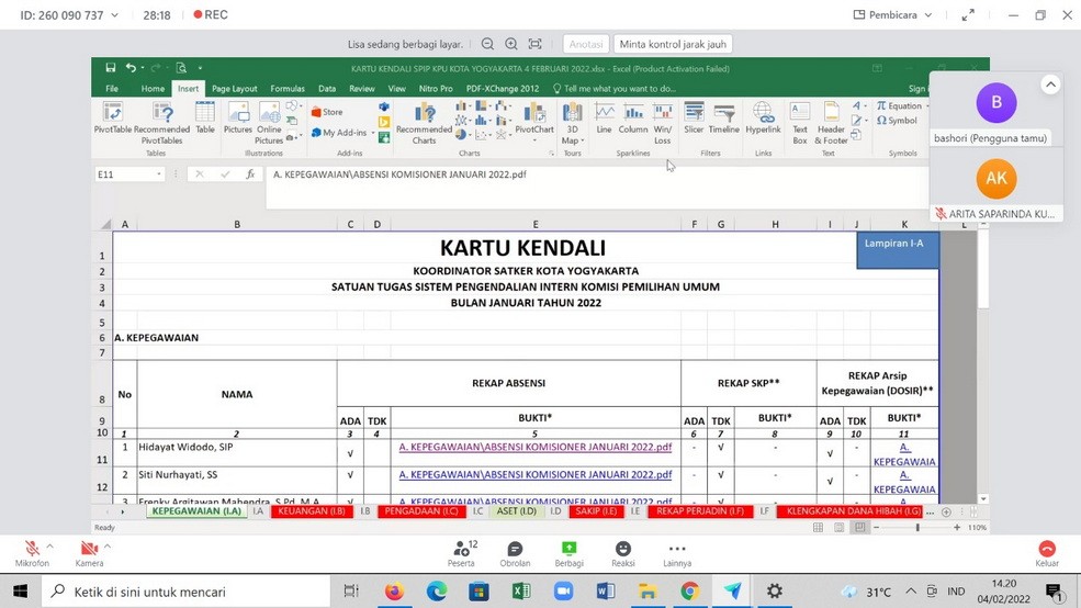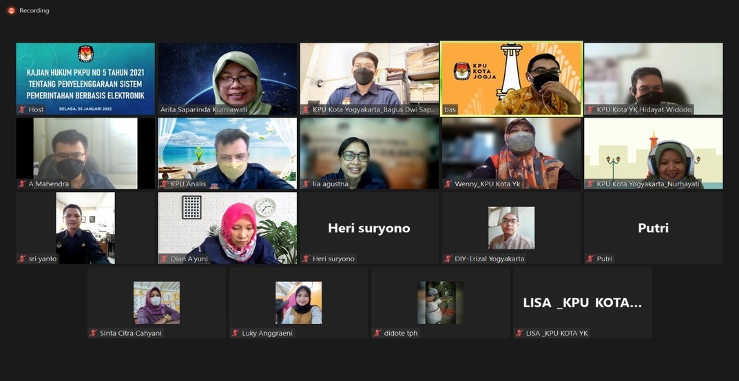 Yogyakarta, Jum’at, 4 Februari 2022, KPU Kota Yogyakarta untuk periode bulan Januari 2022, kembali menggelar Rapat Pleno Pengisian dan Penetapan Kartu Kendali Sistem Pengendalian Intern Pemerintah (SPIP), dengan mempergunakan aplikasi lark. SPIP adalah proses yang integral pada tindakan dan kegiatan yang dilakukan secara terus menerus oleh pimpinan dan seluruh pegawai untuk memberikan keyakinan memadai atas tercapainya tujuan organisasi melalui kegiatan yang efektif dan efisien. Rapat Pleno Pengisian dan Penetapan Kartu Kendali dipimpin oleh Ketua KPU Kota Yogyakarta Hidayat Widodo. Sedang untuk memeriksa kesesuaian pengisian lampiran dengan dokumen pendukung dipandu Kadiv Hukum dan Pengawasan KPU Kota Yogyakarta Bashori Alwi, yang dihadiri oleh semua Komisioner, Sekretaris, dan Satgas SPIP KPU Kota Yogyakarta. Pada rapat pleno ini, dilakukan pemeriksaan lampiran dengan dokumen pendukung kartu kendali SPIP, yang meliputi lampiran kepegawaian, keuangan negara, hibah, pengadaan, persedian dan asset BMN, SAKIP, rencana kerja tahunan, rencana aksi tahun 2022 dan kelengkapan administrasi pengelolaan dana hibah. Setelah dilakukan pemeriksaan, pimpinan rapat pleno memberikan kesempatan kepada peserta yang hadir untuk menyetujui kelengkapannya. Oleh peserta rapat pleno secara aklamasi kartu kendali SPIP periode Januari tahun 2022 diterima, dan disetujui, sehubungan sudah sesuai dengan regulasi. Rapat pleno menetapkan Kartu Kendali SPIP periode bulan Januari tahun 2022, dengan pembacaan Berita Acara Pengisian dan Penetapan Kartu Kendali SPIP. Untuk selanjutnya semua dokumen tersebut dikirimkan ke KPU DIY via email dihari yang sama oleh Satgas SPIP KPU Kota Yogyakarta.(Ar)*