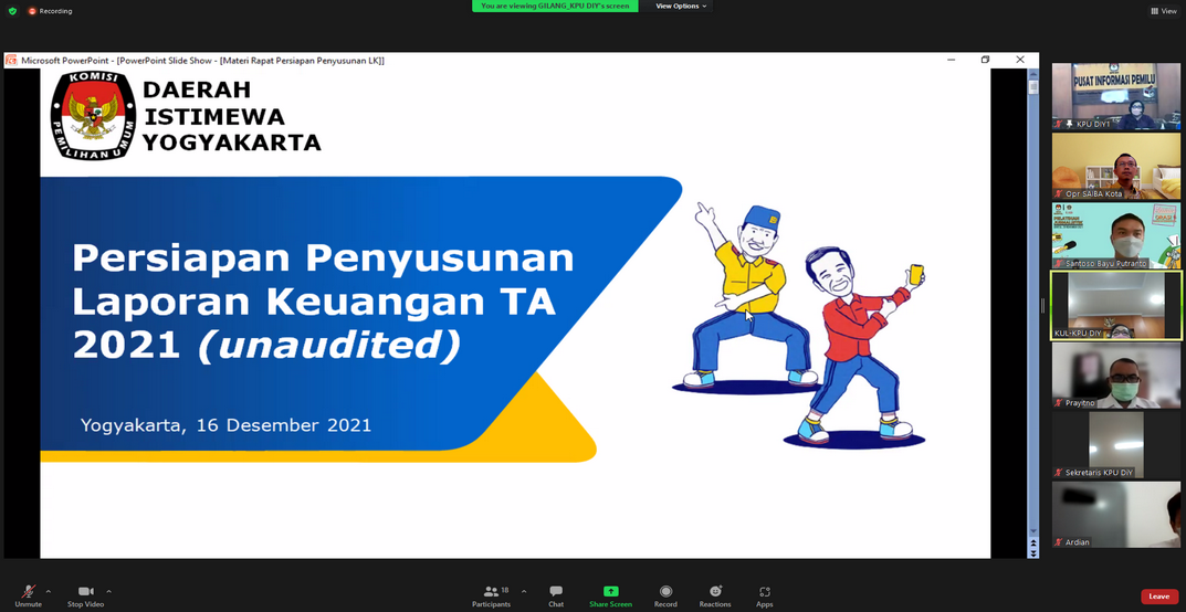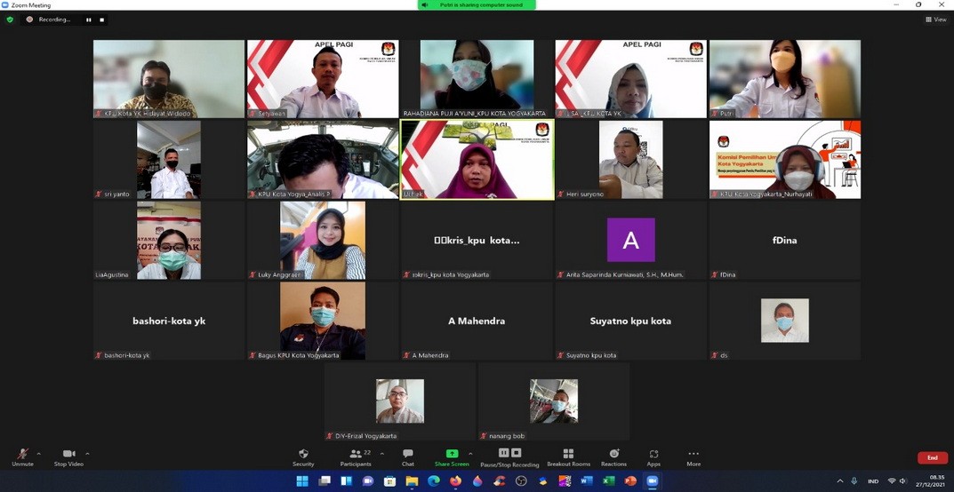 Yogyakarta- KPU Kota Yogyakarta melaksanakan kegiatan apel pagi yang rutin melalui zoom cloud meeting, Senin 27 Desember 2021 tepat pukul 08.30 WIB. Apel diikuti oleh jajaran komisioner KPU Kota Yogyakarta, sekretaris, pejabat struktural, staf sekretariat dan semua Tenaga Kontrak. Pembina apel kali ini adalah Kadiv Rendatin KPU Kota Yogyakarta, Siti Nurhayati. Petugas apel, pembawa acara Suci Astuti H, Pembacaan Undang – Undang oleh Sinta Citra Cahyani dan Pembacaan Panca Prasetya Korpri oleh Heri Suryono. Dalam pengarahannya, Siti Nurhayati menyampaikan kita harus selalu bersyukur diberikan kesempatan untuk selalu memperbaiki diri. Semakin dekat menuju pemilu dan pemilihan serentak 2024, SDM KPU harus meningkatkan kapasitas dan menjaga amanah dengan menunjukkan integritas yang tinggi sebagai penyelenggara pemilu. Cara terbaik adalah dengan mempelajari apa yang belum bisa dikerjakan, karena mempelajari ilmu secara perlahan lahan di dalamnya ada pahalanya. Disampaikan lebih lanjut, “Sebagai SDM KPU seyogyanya jangan mengejar sunah dengan meninggalkan yang wajib, dalam arti kewajiban sebagai pegawai KPU adalah melaksanakan tugas di KPU, memaksimalkan amanah yang diberikan oleh negara”. Karena dunia hanya memiliki 3 hari, hari kemarin ( sudah lewat dan tidak bisa di ulang), hari ini ( kesempatan untuk memperbaiki kesalahan di hari kemarin) dan hari esok (belum pasti apa yang akan terjadi). Apel pagi di tutup dengan pembacaan doa oleh Kadiv Teknis, Erizal, memohon keselamatan, kesehatan dan perlindungan dari Allah SWT, Tuhan Yang Maha Esa. (LEA)