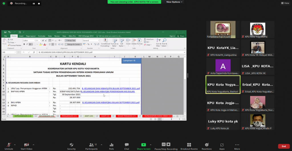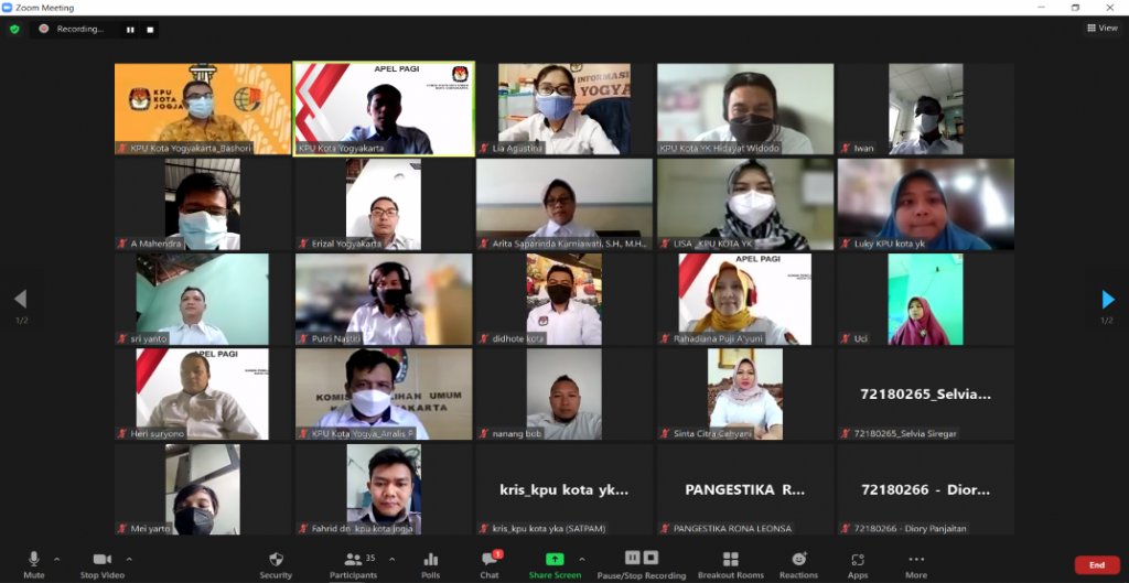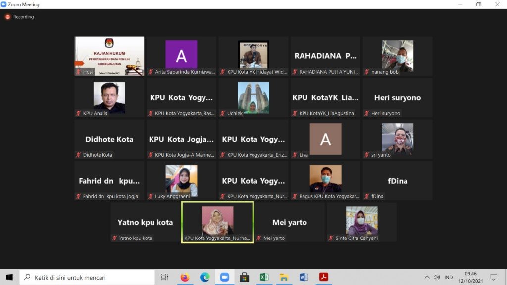 Yogyakarta, 12 Oktober 2021. Untuk meningkatkan pemahaman semua SDM terkait pelaksanaan proses PDB yang dilaksanakan KPU Kota Yogyakarta diselenggarakanlah kajian hukum. Kajian hukum juga bertujuan menguatkan literasi regulasi PDB di tahun 2021 ini. Oleh karenanya ketua KPU Kota Yogyakarta dalam sambutan pengantar berpesan bahwa jadikanlah kajian ini sebagai upaya mengupdate dan merefresh kembali PDB. Oleh karenanya, kegiatan kajian ini mengundang seluruh SDM di satker KPU Kota Yogyakarta agar ada sharing terkait informasi kependudukan di wilayah kota Yogyakarta. Baik itu info TMS (meninggal, pindah penduduk keluar Kota Yogyakarta, alih status menjadi TNI, Polri) maupun info pemilih baru (memasuki usia 17 tahun, belum 17 tahun tapi pernah kawin, pindah masuk penduduk kota Yogyakarta, purna tugas TNI, Polri). Dengan demikian harapannya proses PDB di KPU Kota Yogyakarta terselenggara dengan sukses setelah sebelumnya juga mendapat dukungan dan masukan data dari pihak terkait di tingkat Kota Yogyakarta. Kajian hukum di moderatori oleh Kadiv Hukum dan Pengawasan, Bashori Alwi. Sedang pemateri adalah Kadiv Rendatin, Nurhayati. Sedang peserta kajian adalah semua komisioner, pejabat struktural, jajaran sekretariat dan tenaga kontrak tidak terkecuali hadir dengan antusias. Kajian hukum ini mengambil materi pembahasan UU Nomor 7 tahun 2017 tentang PEMILU pasal 20 huruf (l) tentang KPU Kab/Kota berkewajiban melakukan pemutakhiran dan memelihara data pemilih secara berkelanjutan dengan memperhatikan data kependudukan sesuai ketentuan peraturan perundang-undangan dan Surat Edaran Ketua Komisi Pemilihan Umum Nomor 366/PL.02-SD/01/KPU/IV/2021, tanggal 21 April 2021, perihal : Perubahan Surat Edaran Plt. Ketua Komisi Pemilihan Umum Nomor 132/PL.02-SD/01/KPU/II/2021, tanggal 4 Februari 2021, perihal : Pemutakhiran Data Pemilih Berkelanjutan Tahun 2021. setelah secara detail diuraikan dasar hukum dan proses alur penyelenggaraan PDB ditambah infomasi cek data pemilih yang bisa diakses melalui e-RPP KPU Kota Yogyakarta maka kajian hukum diakhiri dengan sesi tanya jawab dengan peserta dan pemateri.(ba)*