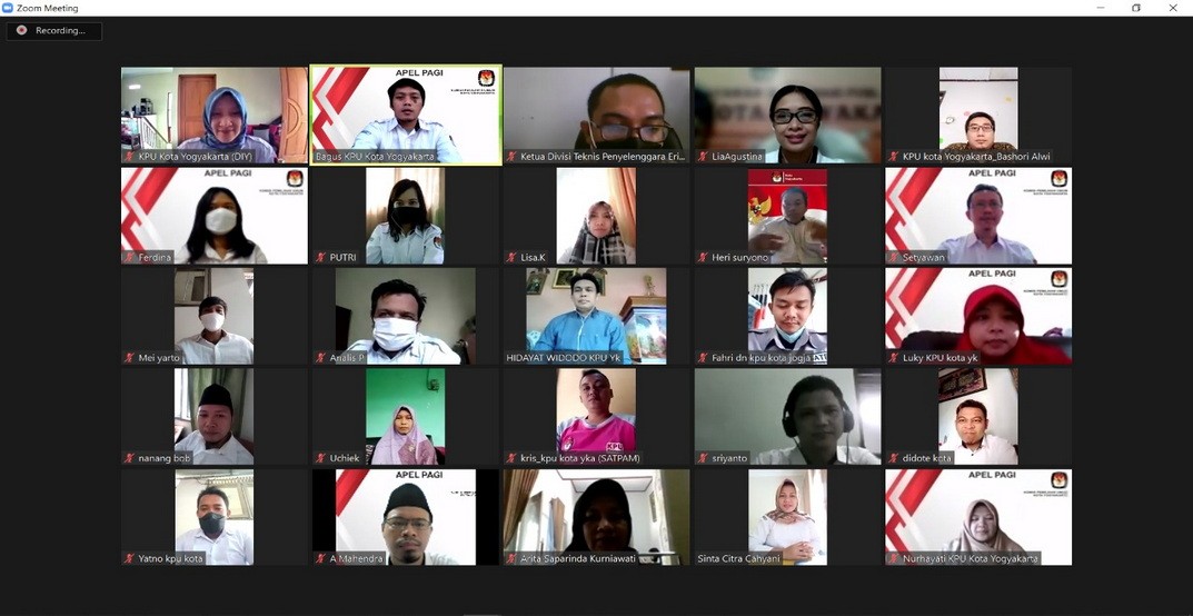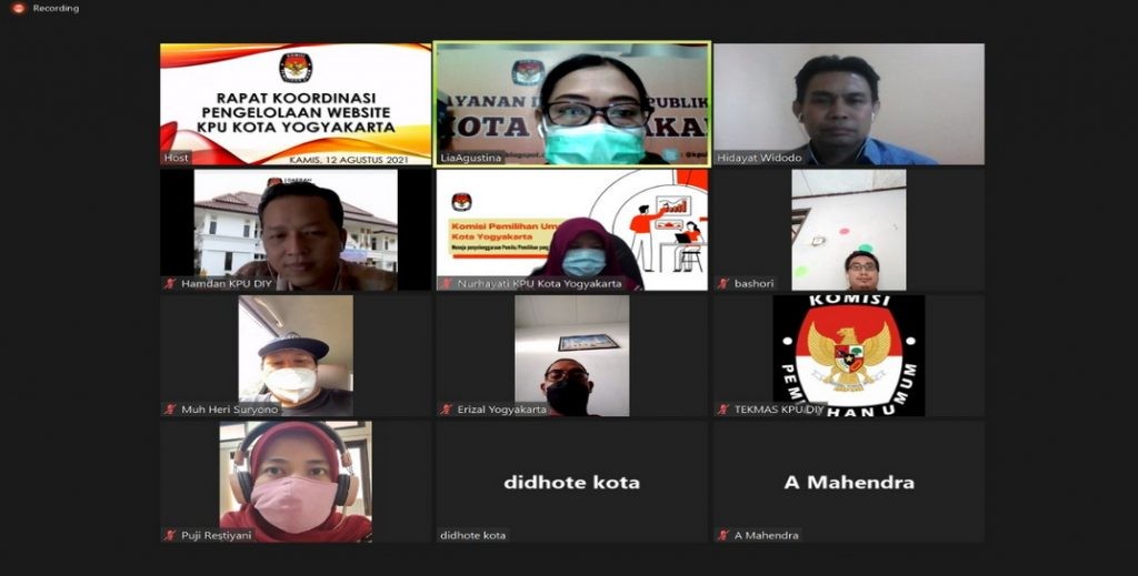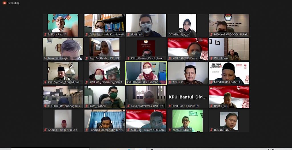 KPU Kota Yogyakarta, dengan personel Ketua KPU Kota Yogyakarta, Kadiv Hukum dan Pengawasan, Sekretaris, Kasubag Hukum dan opertor JDIH Jum’at 13 Agustus 2021 menghadiri Rapat Evaluasi Pengelolaan JDIH tingkat KPU Kabupaten/ Kota se-Daerah Istimewa Yogyakarta dan Sosialisasi Keputusan KPU Nomor 533/HK.04-Kot/03/KPU/XI/2020 tentang Pedoman Teknis Pengelolaan Dokumentasi dan Informasi Hukum di Lingkungan KPU, KPU Provinsi dan KPU Kabupaten/Kota yang dilaksanakan melalui media zoom cloud meeting. Dalam acara tersebut, Kadiv Hukum dan Pengawasan KPU Kota Yogyakarta Bashori Alwi, memaparkan secara detail perkembangan pengelolaan dan pengembangan JDIH KPU Kota Yogyakarta. Dalam pemaparannya berdasar jawaban kuisioner yang sudah dikirim beberapa waktu yang lalu ke KPU DIY, Bashori Alwi menyatakan, “Bahwa pengelolaan dan pengembangan JDIH KPU Kota Yogyakarta sudah sesuai dengan Keputusan KPU Nomor 533/HK.04-Kot/03/KPU/XI/2020”. Dan akhirnya hasil review KPU DIY lewat Kadiv Hukum dan Pengawasan KPU DIY Siti Ghoniyatun, dinyatakan jawaban kuisioner pengelolaan JDIH KPU Kota Yogyakarta memang sudah sesuai dengan regulasi yang ada. Sebelumnya Ketua KPU DIY melalui sambutannya menyampaikan bahwasanya JDIH merupakan suatu wadah pendayagunaan atas dokumentasi hukum secara tertib, terpadu dan berkesinambungan, serta merupakan sarana pemberian pelayanan informasi hukum secara lengkap, akurat, mudah, dan cepat. KPU DIY juga melaksanakan monitoring dan evaluasi JDIH melalui kuesioner yang di bagikan ke KPU Kabupaten Kota. Monitoring dan evaluasi pengelolaan JDIH terkait hasil kuisioner dari KPU Kabupaten/Kota dengan mendiskusikan dalam 3 tahapan, yaitu Review kuisioner,kompilasi jawaban kuisioner pengelolaan JDIH KPU Kabupaten/Kota, dan Mengulik/mengulas lebih lanjut kedalaman jawaban kuisioner masing – masing KPU Kabupaten /Kota. (LK)