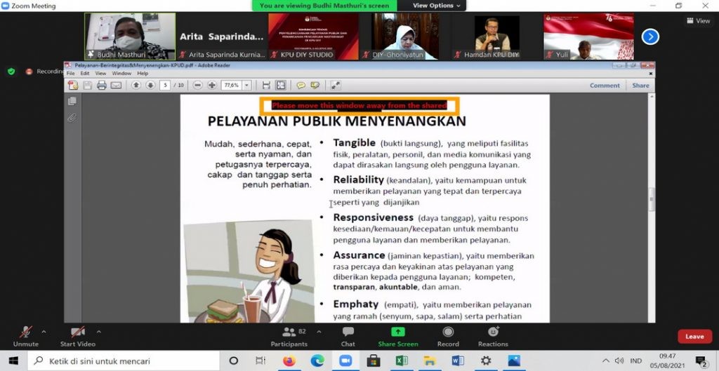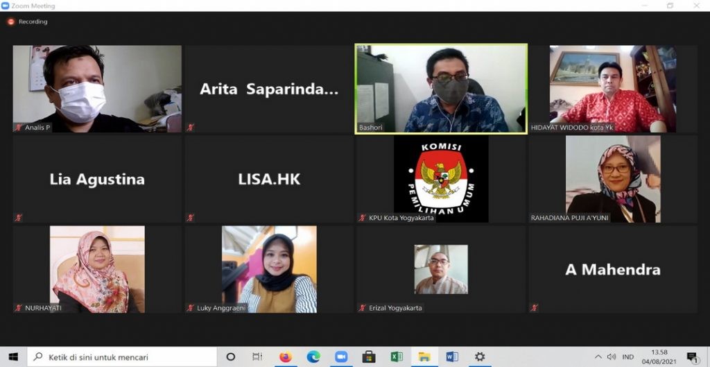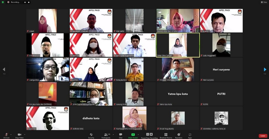 Yogyakarta – Pemberlakuan Pembatasan Kegiatan Masyarakat (PPKM) Level 4 dan Level 3 Corona Virus Disease 2019 di Wilayah Jawa dan Bali yang mengharuskan 100% pegawai bekerja dari rumah, sehingga apel pagi minggu kedua bulan Agustus dilaksanakan secara daring melalui aplikasi zoom cloud meeting. Menindaklanjuti Surat Komisi Pemilihan Umum Nomor 604/SDM.03.5-SD/05/KPU/VI/2021, tertanggal 30 Juni 2021 tentang Himbauan Pelaksanaan Apel Pagi dan Surat Ketua Komisi Pemilihan Umum Kota Yogyakarta Nomor 100/SDM.03.3-SD/3471/KPU-Kot/VII/2021, tertanggal 5 Juli 2021 tentang Pelaksanaan Apel Pagi, maka tiap hari Senin dilaksanakan Apel Pagi. Pada hari Senin, tanggal 9 Agustus 2021 dilaksanakan Apel Pagi untuk kedua kalinya dimasa PPKM. Adapun pegawai yang bertugas pada apel pagi ini adalah Bagus Dwi Saputra sebagai Host, Lisa Kadarwati sebagai Pembaca Naskah Pembukaan Undang-Undang Dasar Negara Republik Indonesia Tahun 1945, Sriyanto sebagai Pembaca Naskah Panca Prasetya Korpri, dan Analis Primadani sebagai Pembaca Doa. Apel Pagi diawali dengan laporan oleh masing-masing sub. bagian. Bertindak selaku Pembina Apel Bapak Frenky Argitawan Mahendra. Apel Pagi dihadiri oleh seluruh pegawai di Lingkungan Komisi Pemilihan Umum Kota Yogyakarta. Dalam arahannya, Bapak Frenky Argitawan Mahendra menyampaikan bahwa menjelang Peringatan Hari Kemerdekaan Republik Indonesia ke 76, sejenak untuk mengingat perjuangan tokoh-tokoh besar seperti Soekarno, Muhammad Hatta, dan Sutan Syahrir. Dari ketiga tokoh tersebut, kita dapat mengambil pelajaran Perjuangan yang gigih untuk mencapai kemerdekaan. Belajar perilaku tepat waktu dalam kegiatan dan tentunya kita sebagai penyelenggara pemilu juga harus bisa menjaga integritas sebagaimana dicontohkan para Pendiri Bangsa Indonesia. Apel pagi ditutup dengan membaca doa, agar senantiasa selalu diberikan kesehatan, petunjuk dan perlindungan Tuhan Yang Maha Esa, dalam melaksanakan tugas sehari-hari. (Ar)