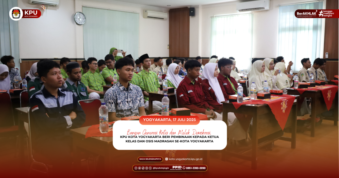 Yogyakarta, 17 Juli 2025 – Komisi Pemilihan Umum (KPU) Kota Yogyakarta terus tunjukkan komitmennya dalam tingkatkan kesadaran politik di kalangan pemilih pemula. Salah satu upaya konkret diwujudkan melalui kegiatan Pembinaan Ketua Kelas dan Ketua OSIS Madrasah yang digelar di Aula Kementerian Agama (Kemenag) Kota Yogyakarta. Kegiatan ini merupakan hasil kerja sama strategis antara KPU Kota Yogyakarta dan Kemenag Kota Yogyakarta, dengan libatkan peserta dari berbagai madrasah seperti MAN 1 Yogyakarta, MAN 2 Yogyakarta, MA Mu'allimaat, MA Mu'allimin, Madrasah Muhammadiyah 1 Yogyakarta, serta beberapa madrasah lainnya. Peserta terdiri dari ketua kelas, pengurus OSIS dan MPK, yang memiliki potensi sebagai agen perubahan di lingkungan sekolah masing-masing. Acara dibuka dengan penuh semangat oleh Master of Ceremony, dilanjutkan dengan sambutan dari Kasi Pendidikan Madrasah Kemenag Kota Yogyakarta, Hj. Elfa Tsurayya, S. Ag., M. Pd. I. yang tekankan pentingnya keterlibatan siswa dalam kehidupan demokrasi sejak dini. “Demokrasi bukan hanya milik orang dewasa. Anak-anak muda harus belajar sejak sekarang agar kelak menjadi pemimpin yang bijak dan berintegritas,” tutur beliau dalam sambutannya. Hadir sebagai narasumber utama, Erizal, S.Th.I, Anggota KPU Kota Yogyakarta sekaligus Ketua Divisi Teknis Penyelenggaraan, yang berikan paparan komprehensif mengenai pentingnya pemilu, pemutakhiran data pemilih berkelanjutan, serta peran strategis KPU dalam menjamin pelaksanaan pemilu yang demokratis. Dalam penyampaiannya, Erizal juga dorong siswa untuk menjadi pemilih aktif dan bertanggung jawab di masa depan, serta turut berperan dalam sampaikan informasi yang benar kepada lingkungan sekitar. Tidak hanya sesi paparan, kegiatan juga diisi dengan diskusi interaktif dan kuis edukatif yang membuat peserta antusias. Banyak pertanyaan kritis dilontarkan oleh siswa terkait hak pilih, penyelenggaraan pemilu, hingga cara mencegah hoaks dan manipulasi informasi menjelang pemilu. “Ini bukan sekadar penyuluhan, tapi dialog demokrasi antara KPU dan generasi muda. Mereka menunjukkan daya kritis dan keingintahuan yang tinggi. Kami sangat mengapresiasi,” ujar Erizal. Acara ditutup dengan sesi foto bersama sebagai simbol kolaborasi dan semangat kebersamaan dalam mendukung demokrasi yang sehat dan inklusif. Kegiatan ini menjadi bagian dari program strategis KPU Kota Yogyakarta dalam rangka Pendidikan Pemilih Pemula, terutama bagi pemilih pemula yang akan memegang peran penting dalam Pemilu dan Pilkada mendatang. Dengan melibatkan para ketua kelas dan OSIS, diharapkan pesan-pesan demokrasi dapat ditularkan secara efektif di lingkungan sekolah. Melalui kegiatan ini, KPU Kota Yogyakarta tegaskan komitmennya untuk terus hadir di tengah masyarakat, terutama generasi muda, sebagai garda terdepan dalam membangun demokrasi yang cerdas, inklusif, dan partisipatif. (salsa)