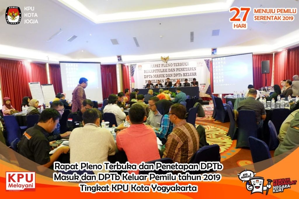 Komisi Pemilihan Umum Kota Yogyakarta telah melaksanakan Rapat Pleno terbuka rekapitulasi dan penetapan Daftar Pemilih Tambahan ( DPTb ) Tahap Kedua Tingkat Kota Yogyakarta pada Pemilhan Umum tahun 2019 bertempat di KJ Hotel pada hari Rabu (20/03/2019).