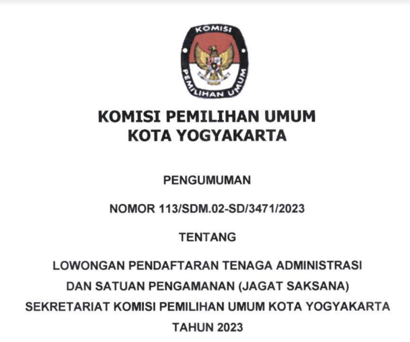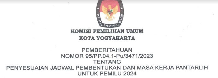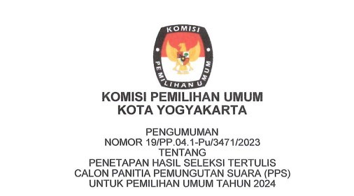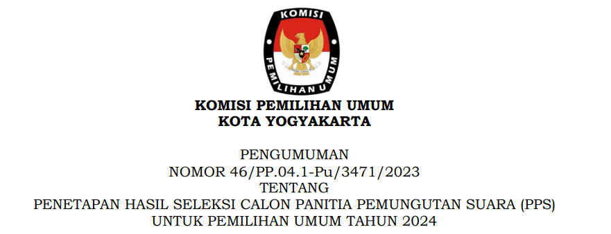 Berdasarkan Berita Acara Rapat Pleno Komisi Pemilihan Umum Kota Yogyakarta, Nomor 8/PP.04.1-BA/3471/2023, tanggal 9 Januari 2023 tentang Rapat Pleno Penetapan Hasil Seleksi Tertulis Calon Panitia Pemungutan Suara (PPS) Pada Pemilu Tahun 2024, disampaikan hal-hal sebagai berikut: