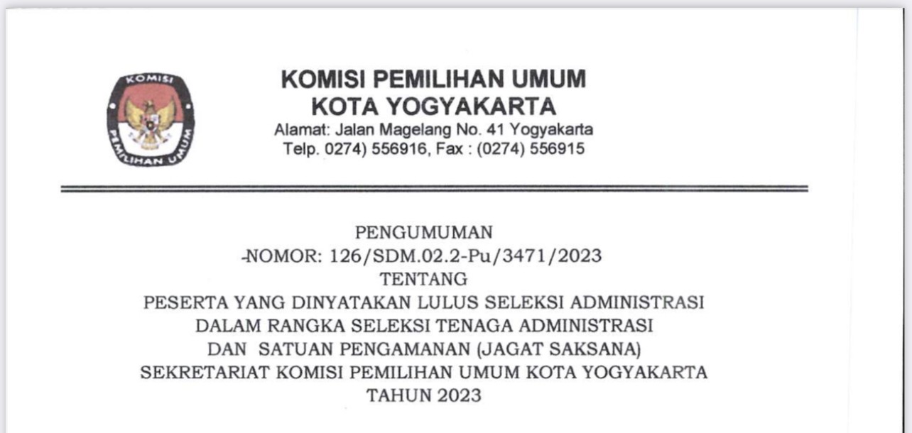 Komisi Pemilihan Umum Kota Yogyakarta telah melaksanakan tahapan seleksi tertulis/ Computer Assisted Test ( CAT ) pada tanggal 7 Januari 2023;