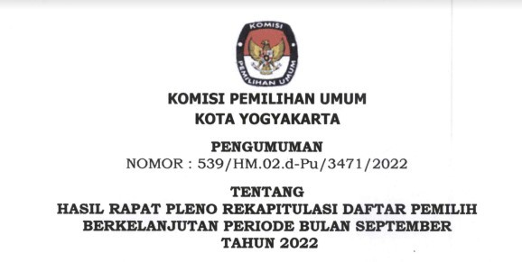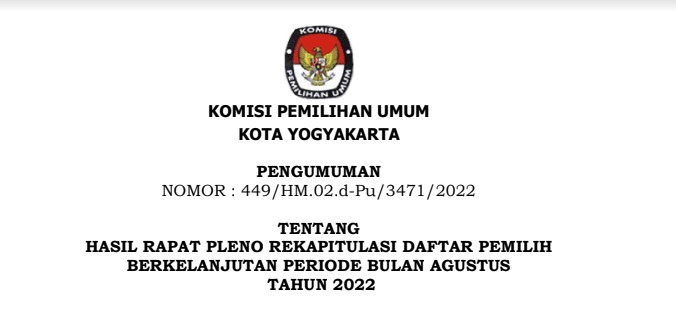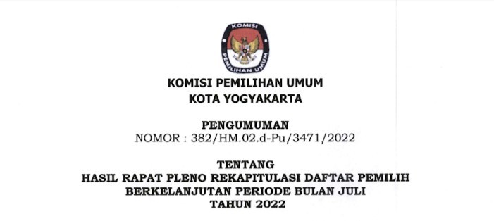 Proses Rapat Pleno Rekapitulasi Daftar Pemilih Berkelanjutan ini, selanjutnya dituangkan dalam Berita Acara Nomor 58/PK.01-BA/3471/2022. Komisi Pemilihan Umum Kota Yogyakarta menetapkan jumlah pemilih pada bulan Agustus 2022 sebanyak 298.859 (Dua Ratus Sembilan Puluh Delapan Ribu Delapan Ratus Lima Puluh Sembilan) pemilih, dengan rincian sebagai berikut :