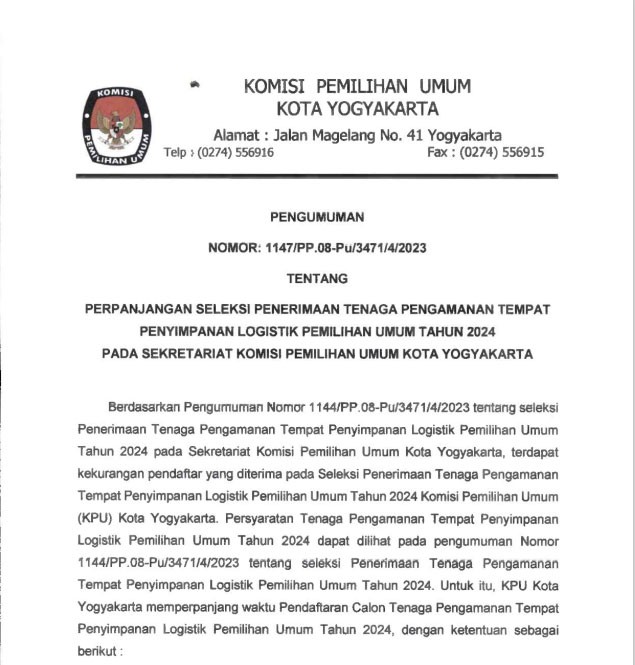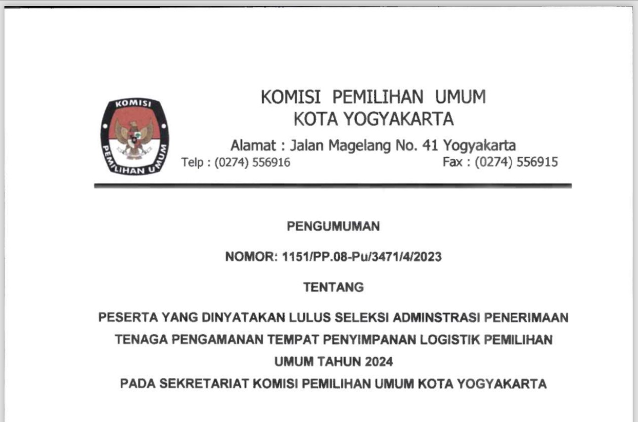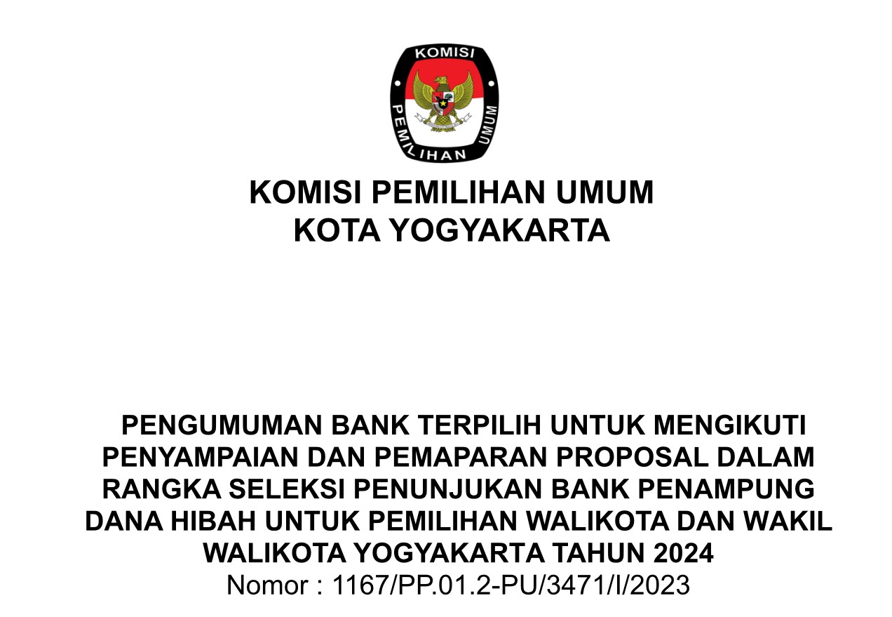 Bahwa untuk melaksanakan ketentuan Pasal 85 ayat (1) Peraturan KPU Nomor 10 Tahun 2023 tentang Pencalonan Anggota Dewan Perwakilan Rakyat, Dewan Perwakilan Rakyat Daerah Provinsi, dan Dewan Perwakilan Rakyat Daerah Kabupaten/Kota, dan berdasarkan Keputusan Komisi Pemilihan Umum Kota Yogyakarta Nomor 166 Tahun 2023 tentang Daftar Calon Tetap Anggota Dewan Perwakilan Rakyat Daerah Kota Yogyakarta Dalam Pemilihan Umum Tahun 2024 tanggal 3 November 2023, KPU Kota Yogyakarta mengumumkan Daftar Calon Tetap (DCT) Anggota DPRD Kota Yogyakarta dan persentase keterwakilan perempuan dalam Daftar Calon Tetap (DCT) sebagaimana terlampir.
